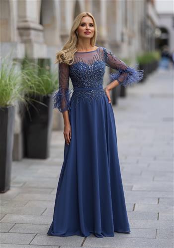 Long sleeve chiffon evening dress with feather applique in vintage indigo