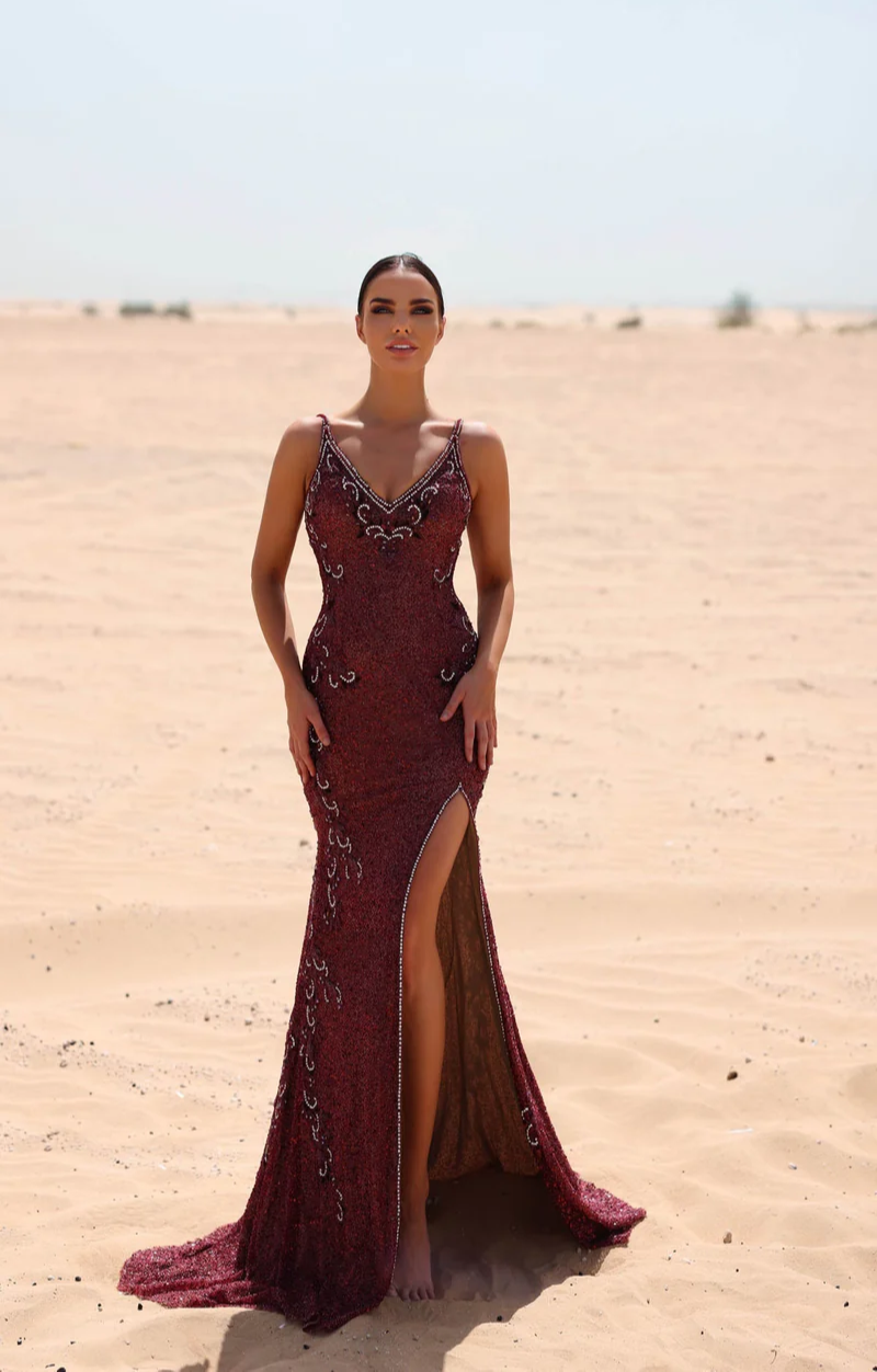 You’ll never want to take this dress off by Chic and Holland AN330023 This glamorous dress features a deep V-neckline with sequin embellishment and embroidered detailing. It also has a slit to show off your favorite pair of heels. The sequin embellished embroidered slit dress will make you the center of attention. The skirt flares out from the knees to the floor allowing you to make a dramatic exit.