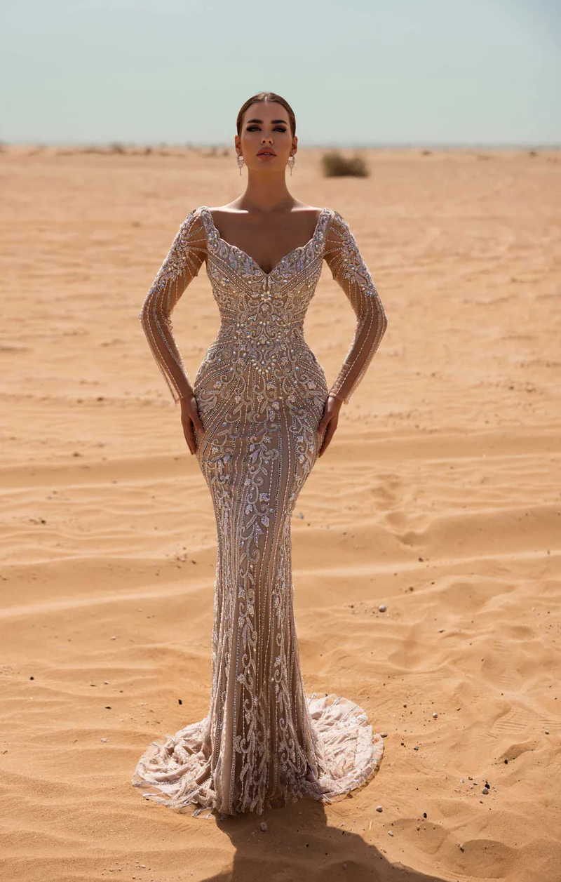 Luxe evening wear is at your fingertips with this gorgeous gown by Chic and Holland HF110067. The V-neckline is lined with sequins that allows a scoop back and is fitted to the waist. The bodice is embellished with a sequin pattern and the full sleeves are also embellished. The skirt is voluminous and full of beautiful sequins that cascades to the floor in a full-length hem.